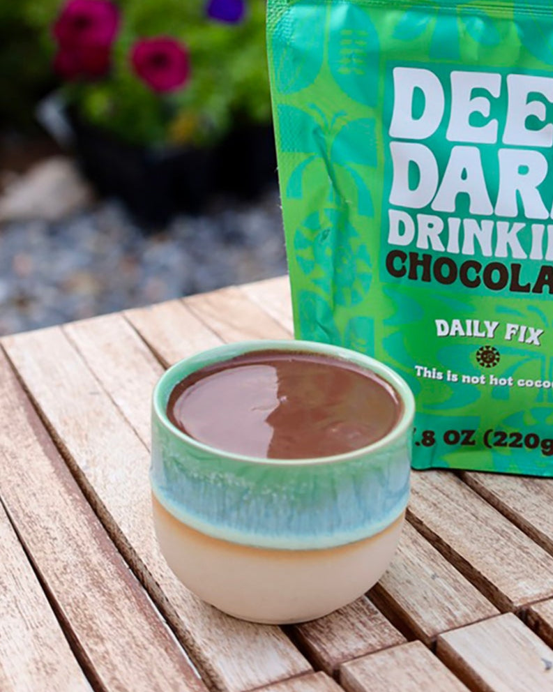 No more scrounging around the house and eating the chocolate chunks out of granola bars in a vain attempt to satisfy your chocolate craving. When you need legitimate dark chocolate satisfaction, head straight for Deep Dark Drinking Chocolate Daily Fix, made with loads of ethically sourced premium dark chocolate, ground to a perfect melting consistency. It's like heaven in a cup. Hey! What you thought was a vice might actually be a virtue.